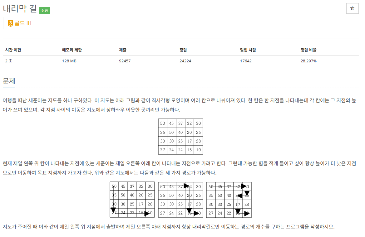 이 문제는 DFS(깊이 우선 탐색) 알고리즘을 사용하여 주어진 지도에서 항상 내리막길로만 이동하는 경로의 개수를 구하는 문제입니다.