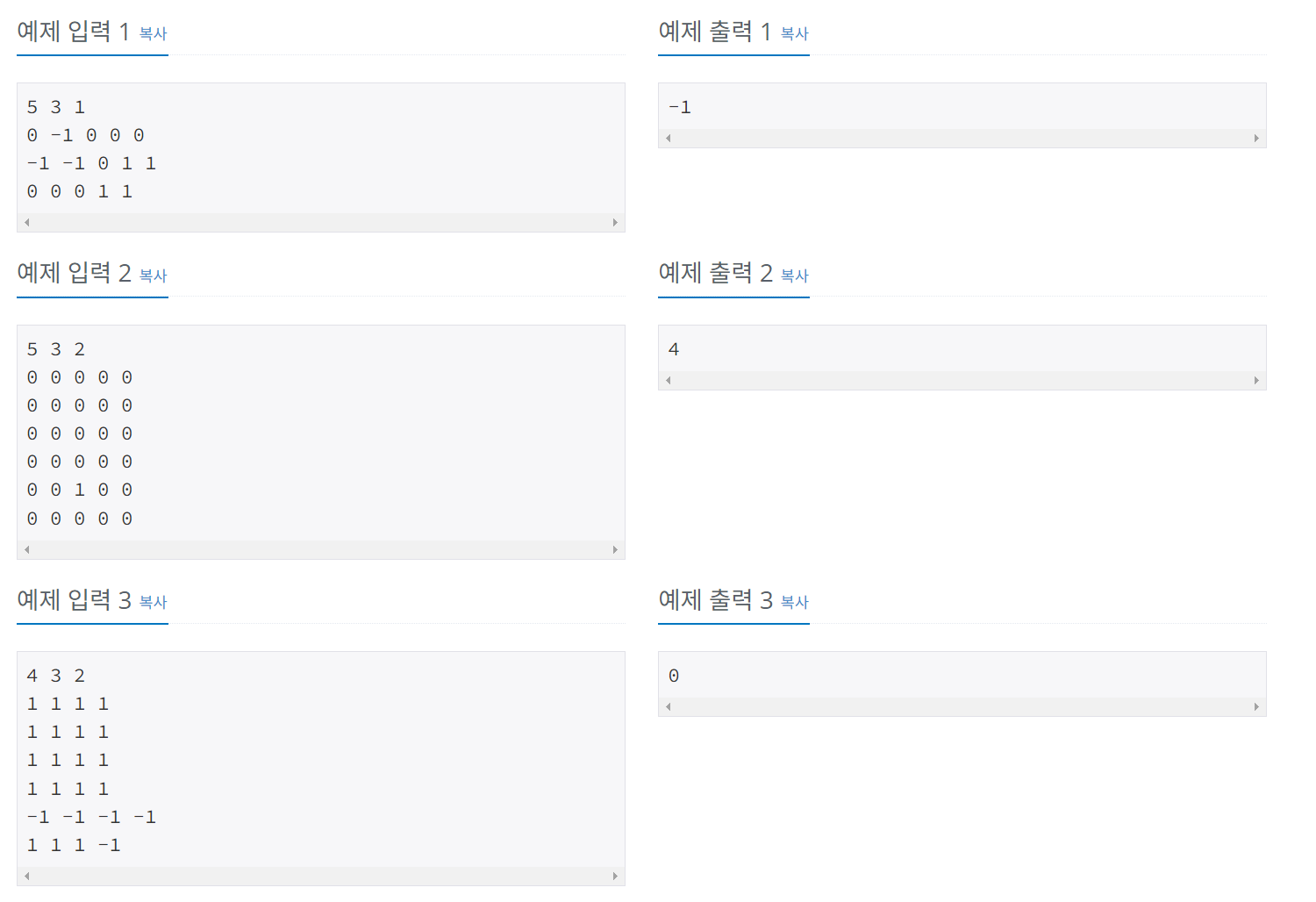 - BFS가 종료되었을 때, 모든 토마토가 익었다면 최소 일수를 출력하고, 익지 않은 토마토가 있다면 -1을 출력합니다.