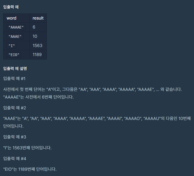 이 문제는 수학적 규칙을 찾아내는 것이 핵심입니다. 사전에서 단어의 순서는 다음과 같은 규칙을 따릅니다.