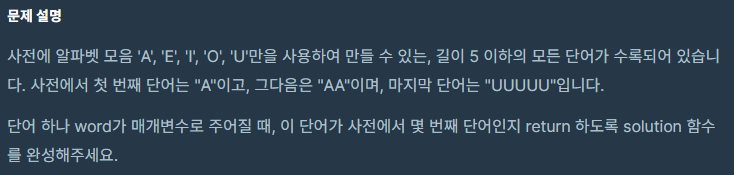 이 문제는 모음으로 이루어진 길이 5 이하의 모든 단어가 수록된 사전에서, 주어진 단어의 순서를 찾는 문제입니다. 이 문제를 해결하기 위해서는 사전에서 단어의 순서를 파악하는 것이 중요합니다.
