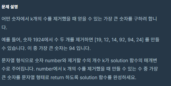 이 문제는 "큰 수 만들기" 문제로, 주어진 숫자에서 특정 개수의 숫자를 제거하여 가장 큰 수를 만드는 것이 목표입니다.