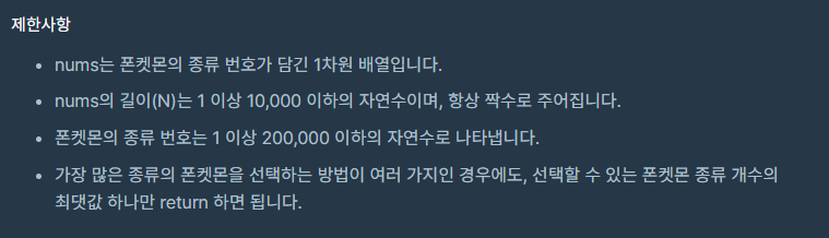 - Set의 크기가 N/2보다 작은 경우: 이때는 원소 종류 수만큼만 선택하는 것이 최대이고, 그 이상 선택하면 중복된 원소가 생기므로 정답은 원소 종류 수가 됩니다.