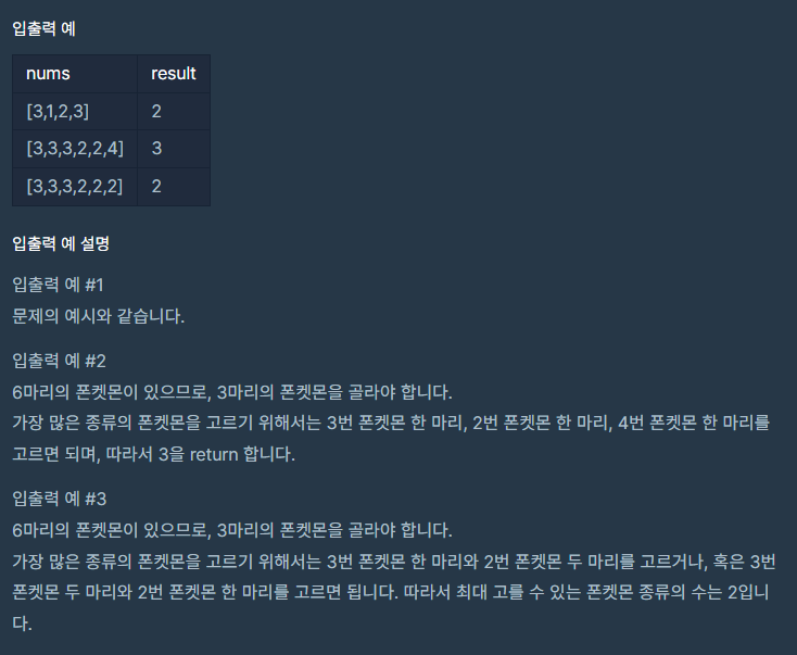 처음에는 Set을 이용해 nums 배열의 중복을 제거한 뒤, Set의 size와 nums 배열 길이의 절반 값을 비교하여 조건에 따라 answer에 할당하는 방식으로 구현했습니다. 코드는 잘 동작하지만 if-else 구문이 들어가는 바람에 다소 길어졌습니다.