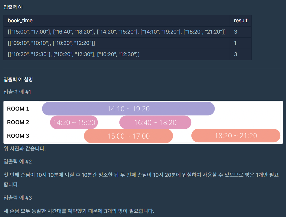예약 시각이 문자열 형태로 담긴 2차원 배열 book_time이 매개변수로 주어질 때, 코니에게 필요한 최소 객실의 수를 반환하는 함수를 완성하는 것이 문제의 목표입니다.